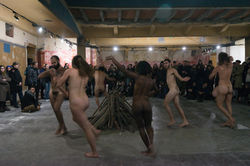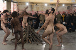 La drammaturgia della mescolanza e dell’indistinto perturbante si approfondisce con il successivo De repente tudo fica preto de gente (2012), basato sul testo Crowds and Power di Elias Canetti. La partecipazione diventa corale con la presenza di 50 performer, professionali e non, europei e africani, provenienti da 14 paesi diversi in Batucada (2014), che creano un flusso ibrido e gioioso che si innesta nella folla degli astanti, con un riferimento preciso alle barche dei migranti e alla necessità di una rinegoziazione delle relazioni socio-culturali dei popoli. Infine Dança Doente (2017) fa riferimento al corpo fragile, dolente, malato, concettualizzato dal fondatore del Butö Tatsumi Hijikata, che Evelin ha studiato per anni in Giappone, ripercorrendone il pensiero e imbevendo se stesso della biografia di Tatsumi fino all’immedesimazione. E’ un corpo sovvertitore che esalta la diversità e la debolezza in opposizione al corpo performante e perfetto dell’immagine egemonica odierna, è un corpo nudo, senza la difesa della maschera identitaria dell’abito. E’ un corpo che trasgredisce all’uniformità contemporanea nella sua alterità, primitività, materialità, desiderio e quindi rappresenta il "male”, che è la sorgiva necessità della libertà e liberazione del corpo, della creatività assoluta. Tutto questo è stato The Invention of Evilness/A Invençao da Maldade che abbiamo visto in prima italiana a Live Arts Week VIII pochi giorni fa. Ci siamo trovati immersi nell’ampio spazio oscuro e spoglio del sotterraneo Cinema Modernissimo, accarezzati dai suoni lievi di un vento evocatore di spiriti, sollecitati da un’atmosfera sempre più coinvolgente, nell’essenzialità della sua struttura drammaturgica: pochi falò di ancestrale memoria, 7 corpi nudi, musica incalzante. Nelle parole di Evelin "è un pezzo violento e di forte necessità. Più che vedere si tratta di un’esperienza”. Cosa è stato e cosa è raccogliersi attorno ad un fuoco, la storia dell’addomesticamento dell’uomo, la necessità di una presa di coscienza e di una resistenza, attraverso visioni altre che si mescolano nella loro ricchezza e nelle fonti più disparate, fino al candomblé brasiliano, una sapienza antica, un approccio diverso al mondo.